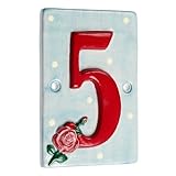 Size: 10 cm x 1 cm x 15 cm.Material: ceramic/glaze. Hand painted cottage garden house number tile, pale blue polkadot background with red relief numbers and rose. CAUTION! Take care when fixing this plaque to a wall, over tightening of the screws can cause the plate to crack. Always tighten the screws (not included) gently & slowly by hand. DO NOT USE A POWER TOOL.